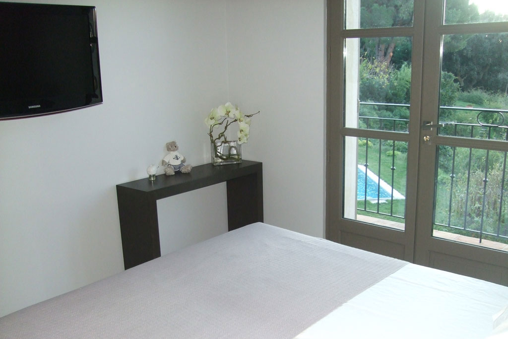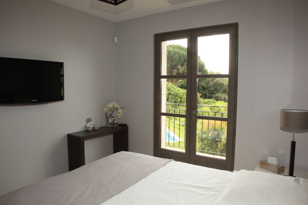 A l'étage, cette jolie chambre équipée de sa salle de bain dispose d'un balcon offrant une vue mer et piscine.